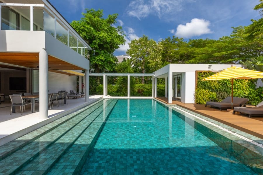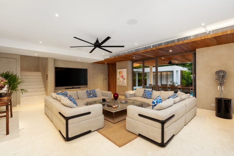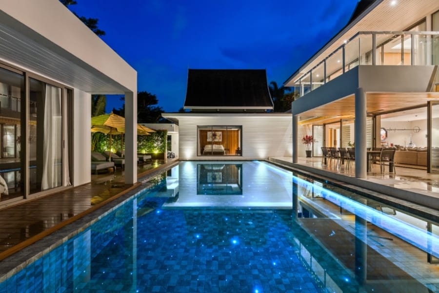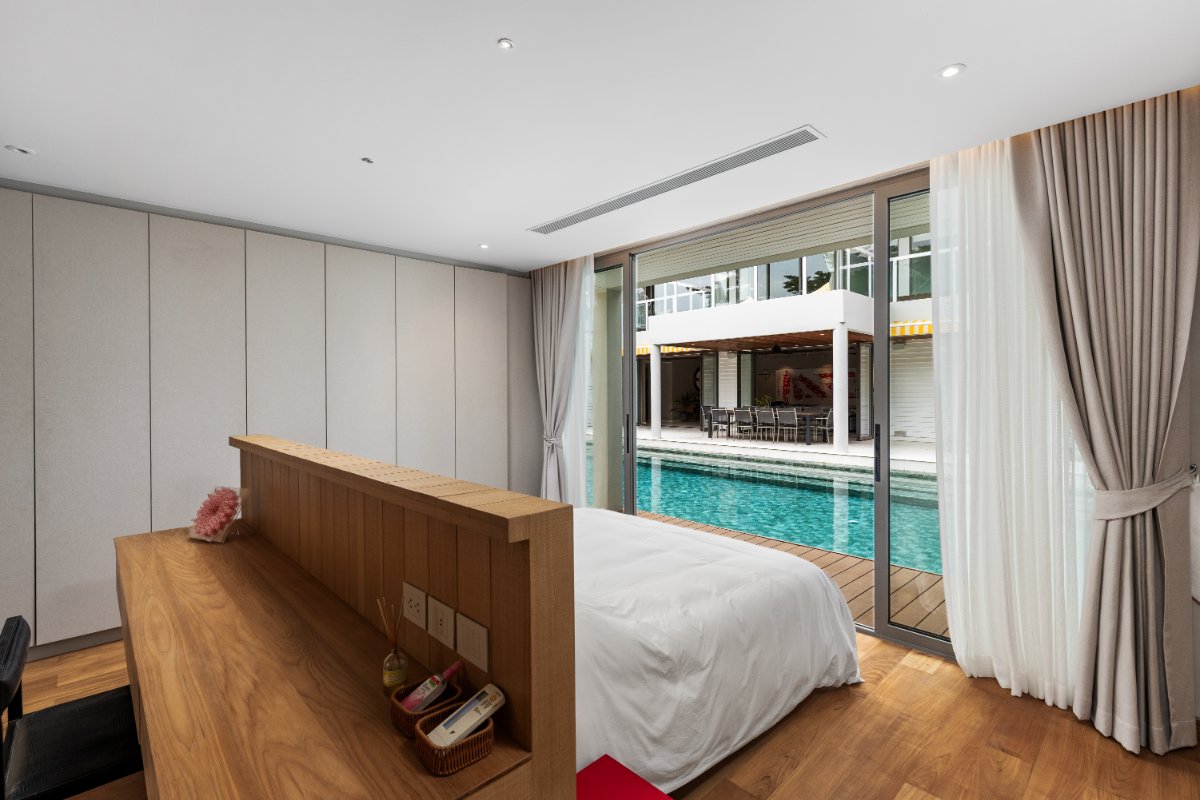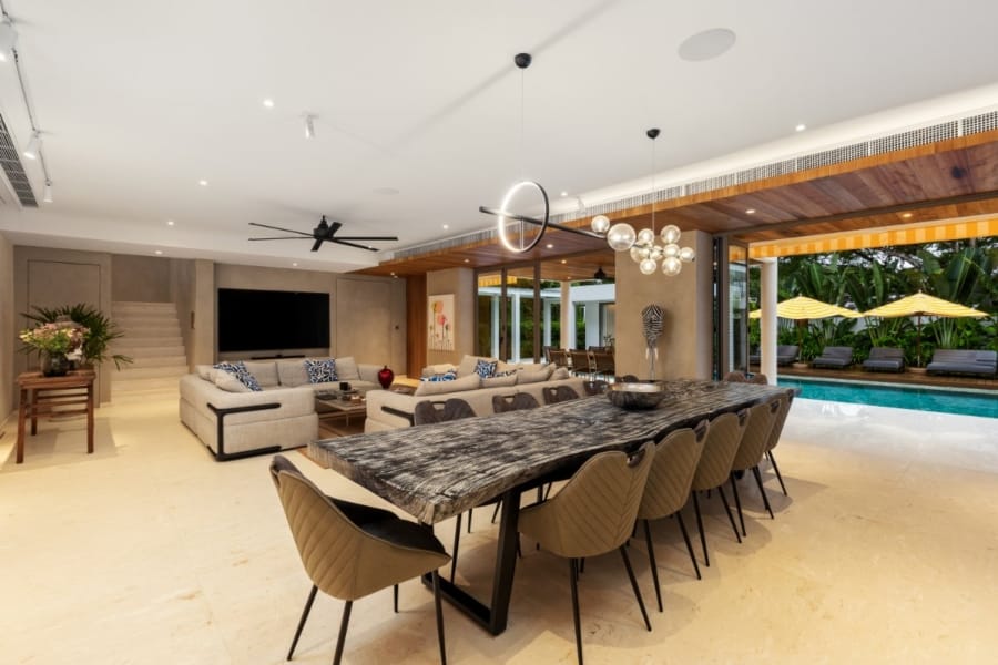 At the heart of the property lies a striking 20 x 6 metre swimming pool, enhanced by architectural LED lighting—creating a seamless indoor-outdoor lifestyle ideal for tropical living. A temperature-controlled wine cellar accommodating up to 2,000 bottles adds a distinctive lifestyle element rarely found in Phuket villas.