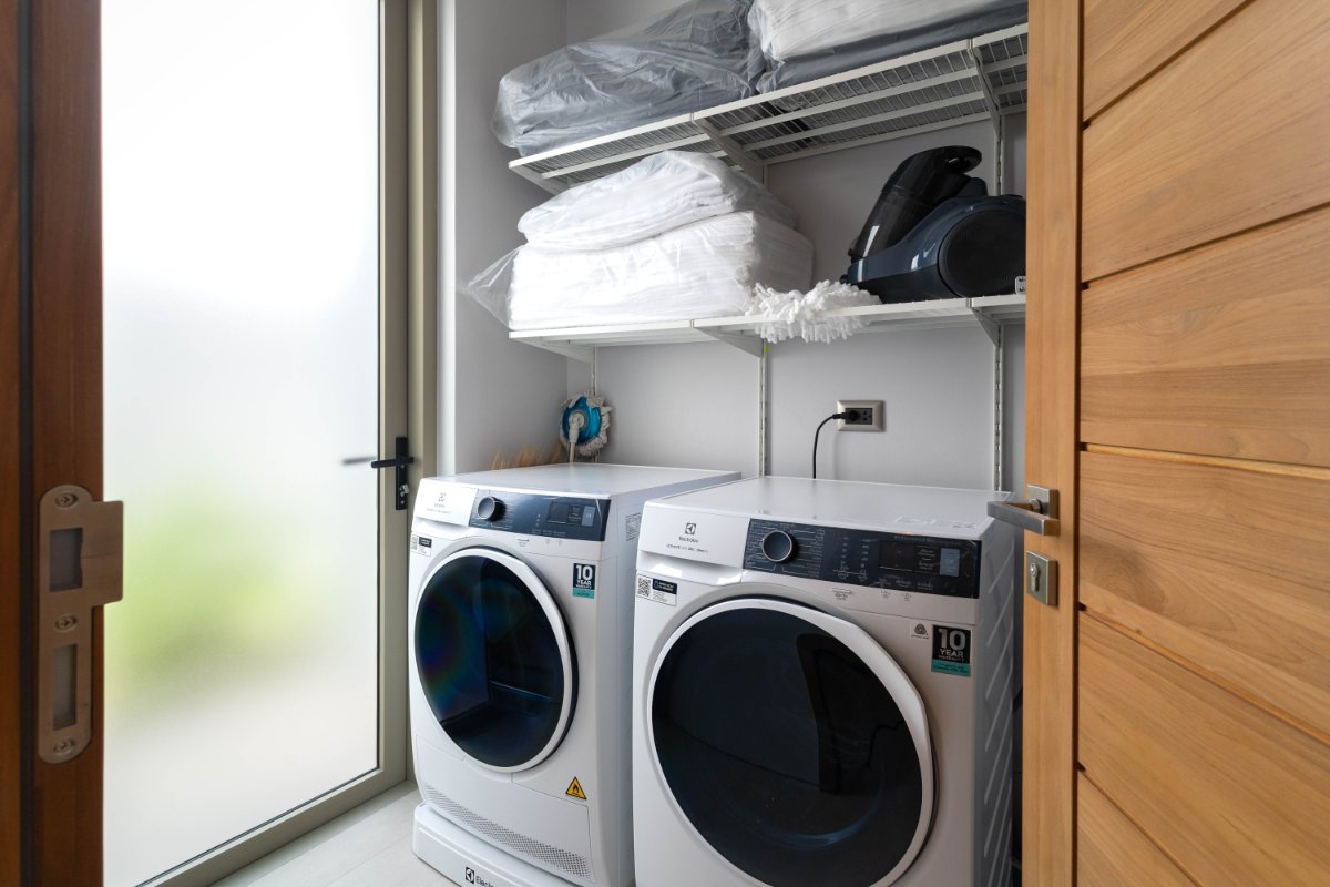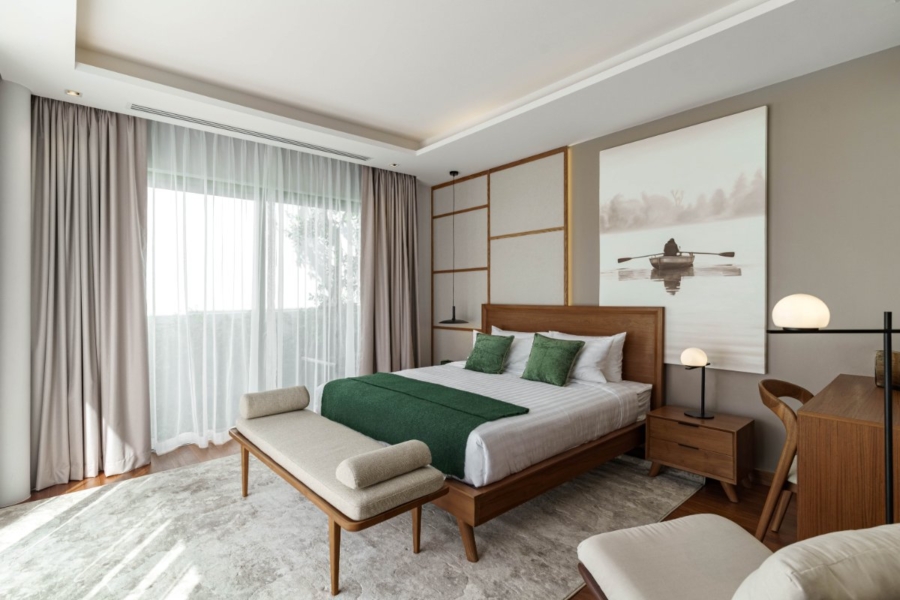Each of the four bedrooms includes an en-suite bathroom, while the master suite offers direct pool access. Additional conveniences include a fully equipped Western kitchen, guest toilet, laundry room, covered parking, and smart storage solutions throughout.