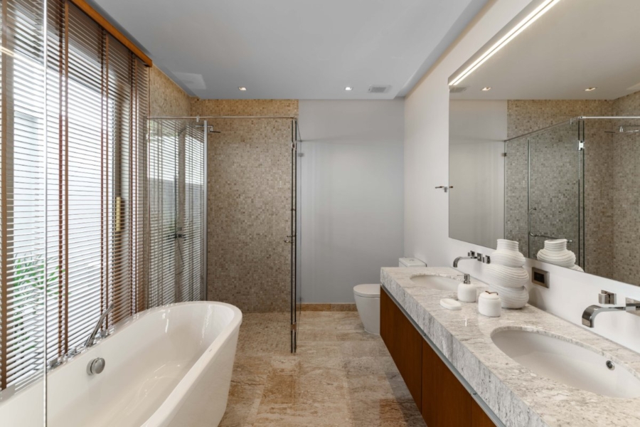 This single-storey layout is masterfully designed for privacy and flow. The entrance opens into a spacious open-plan living and dining area connected to a modern kitchen and overlooking the pool terrace. To the right of the main entrance is the guest bathroom and a separate laundry/utility room. The master bedroom occupies a private corner with a walk-in closet and en-suite bathroom featuring a bathtub and dual vanities.