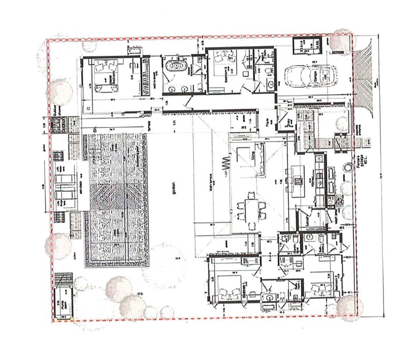 Three additional en-suite bedrooms are spaced out to ensure privacy, with views of the pool or garden. The centerpiece is the 4 x 9.75m saltwater swimming pool, bordered by lush greenery and sun decks, enhancing the indoor-outdoor living experience. A covered carport provides parking for one vehicle, and secure storage rooms are strategically placed throughout the villa.