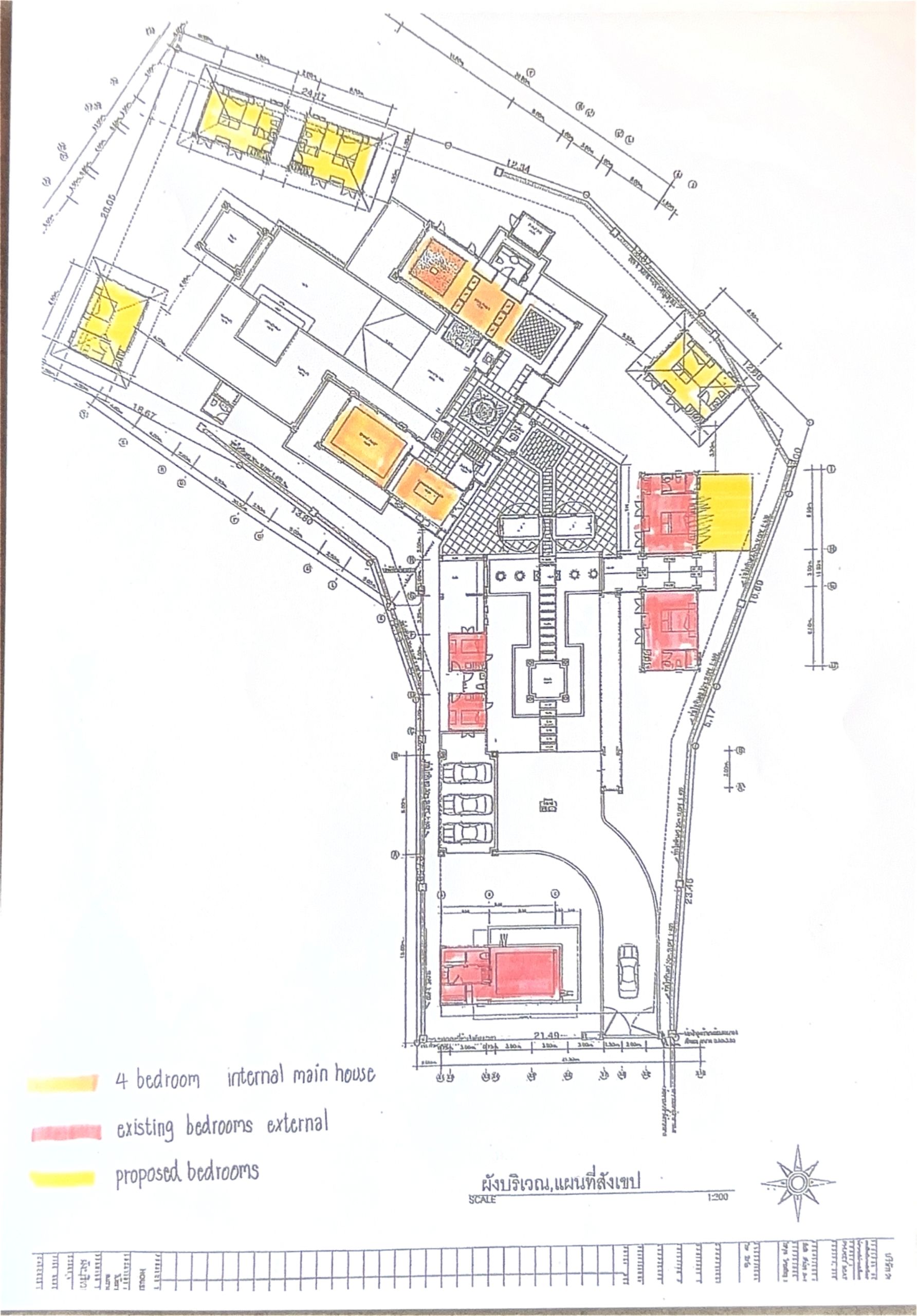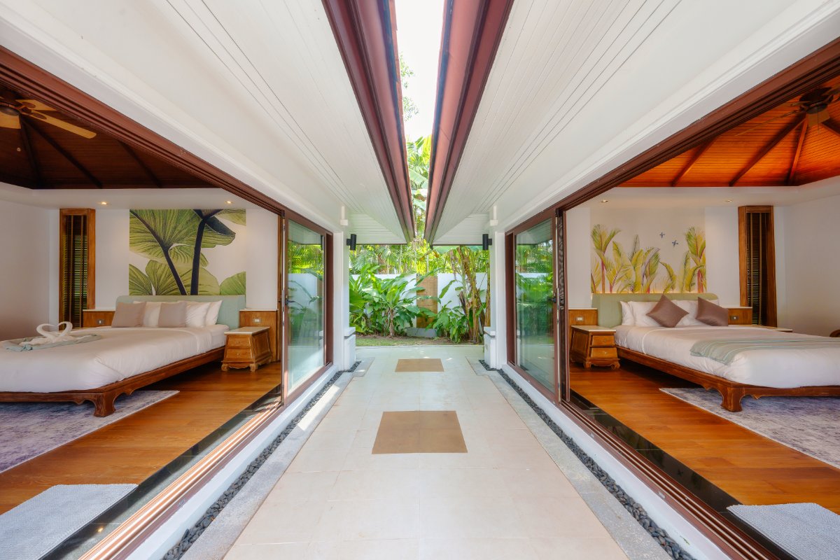 At the heart of the property sits the main residence, housing four expansive en-suite bedrooms, elegant living and dining areas, and direct access to outdoor terraces. Surrounding this central structure are separate guest pavilions, offering additional private bedroom suites—ideal for visitors or extended family.