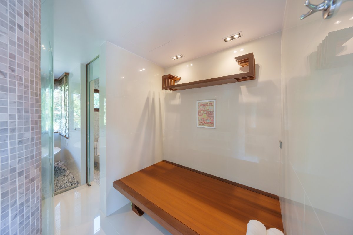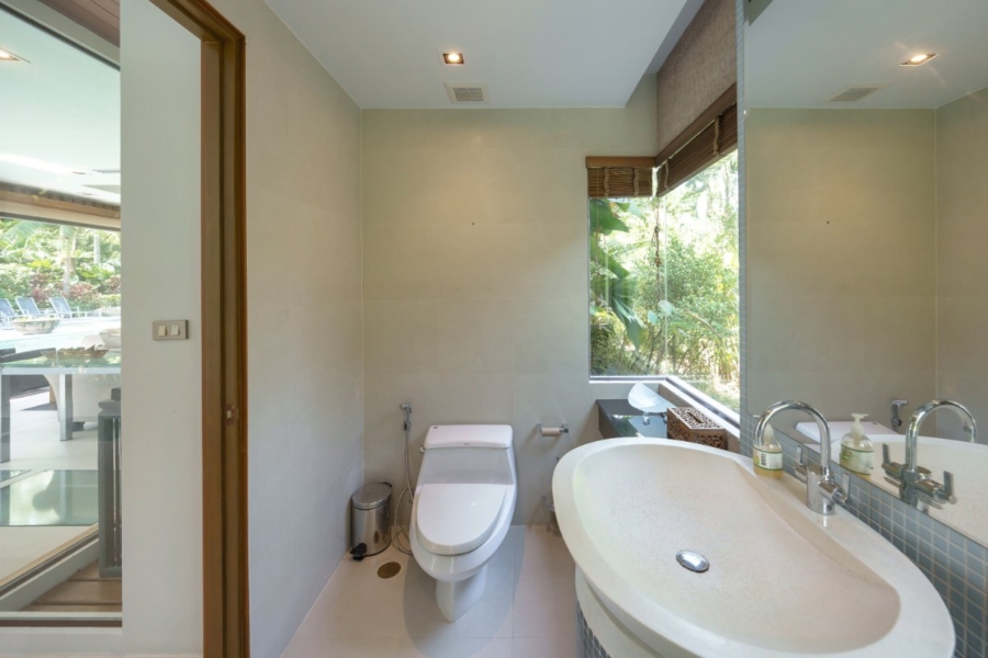 A dedicated wellness wing includes a fully equipped gym/yoga studio with its own bathroom and steam room, positioned for privacy and tranquility. Functional areas such as the outdoor Thai kitchen, laundry, storage rooms, and staff quarters are discreetly integrated within the estate grounds.