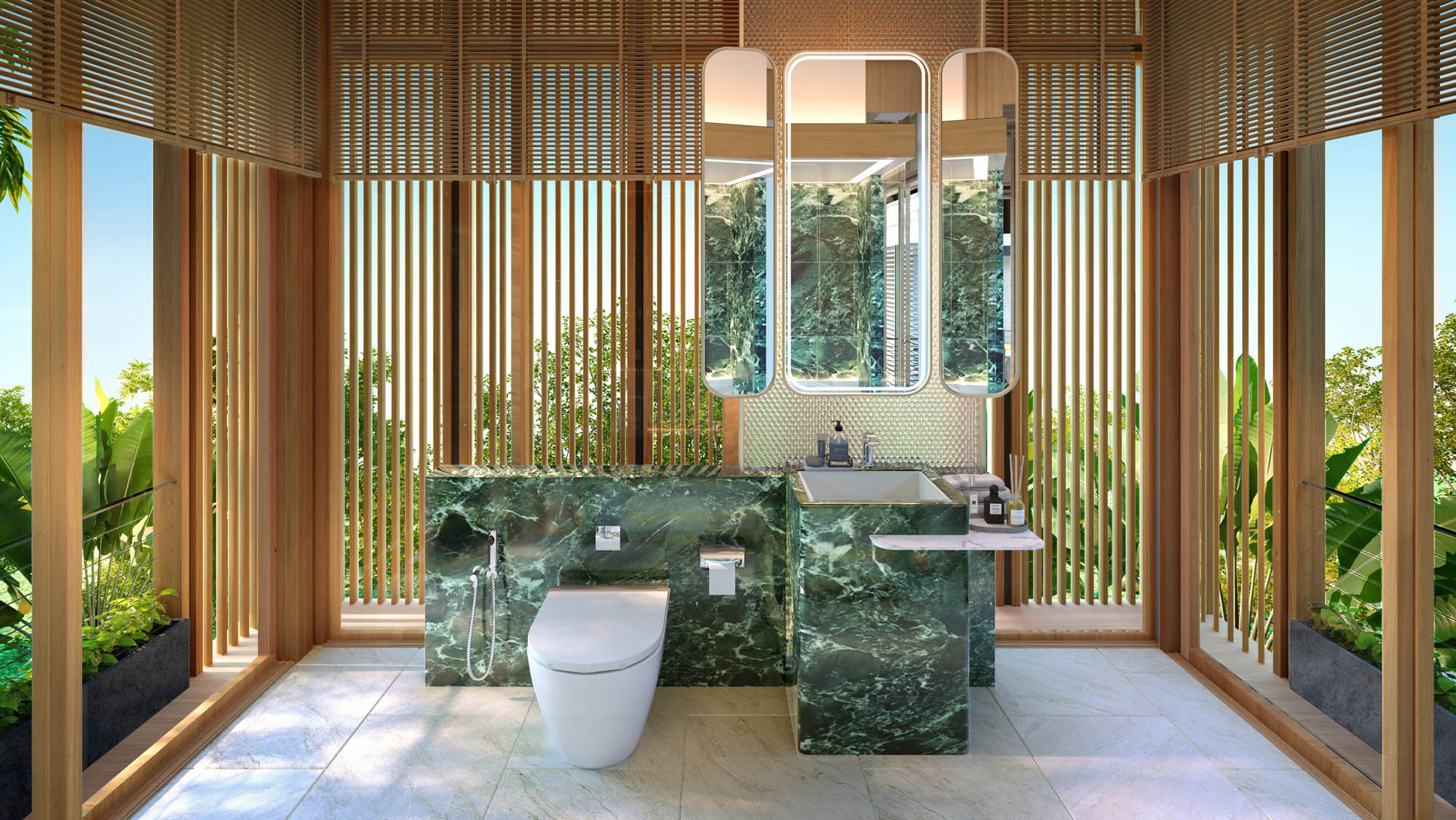 Upstairs, the villa houses a serene second master suite with walk-in closet and private bath, along with two additional bedrooms and bathrooms. A central corridor leads to the Tree House Pavilion, a compact yet flexible space ideal for use as a wellness room, guest suite, or home office, maintaining a strong connection with nature.