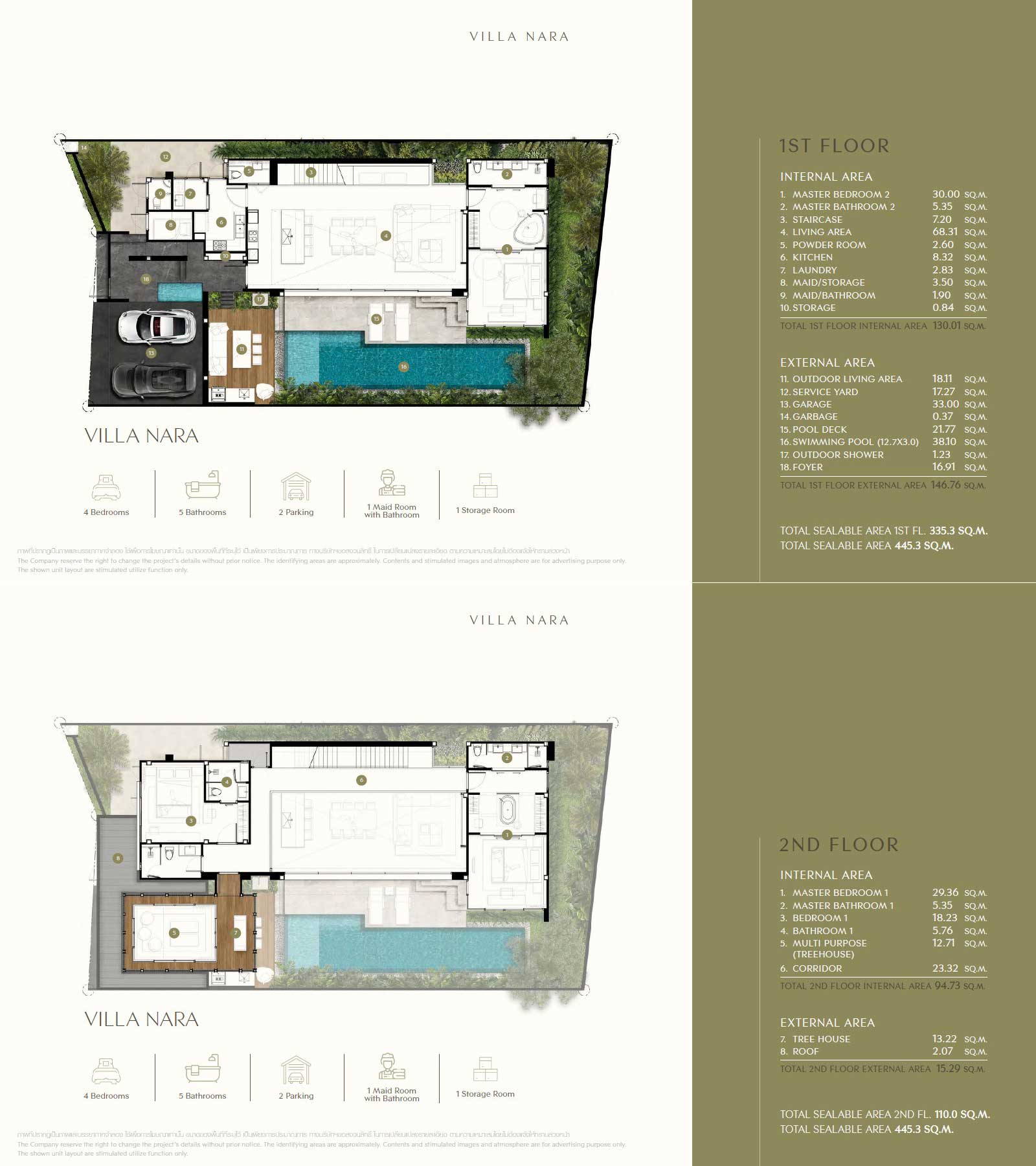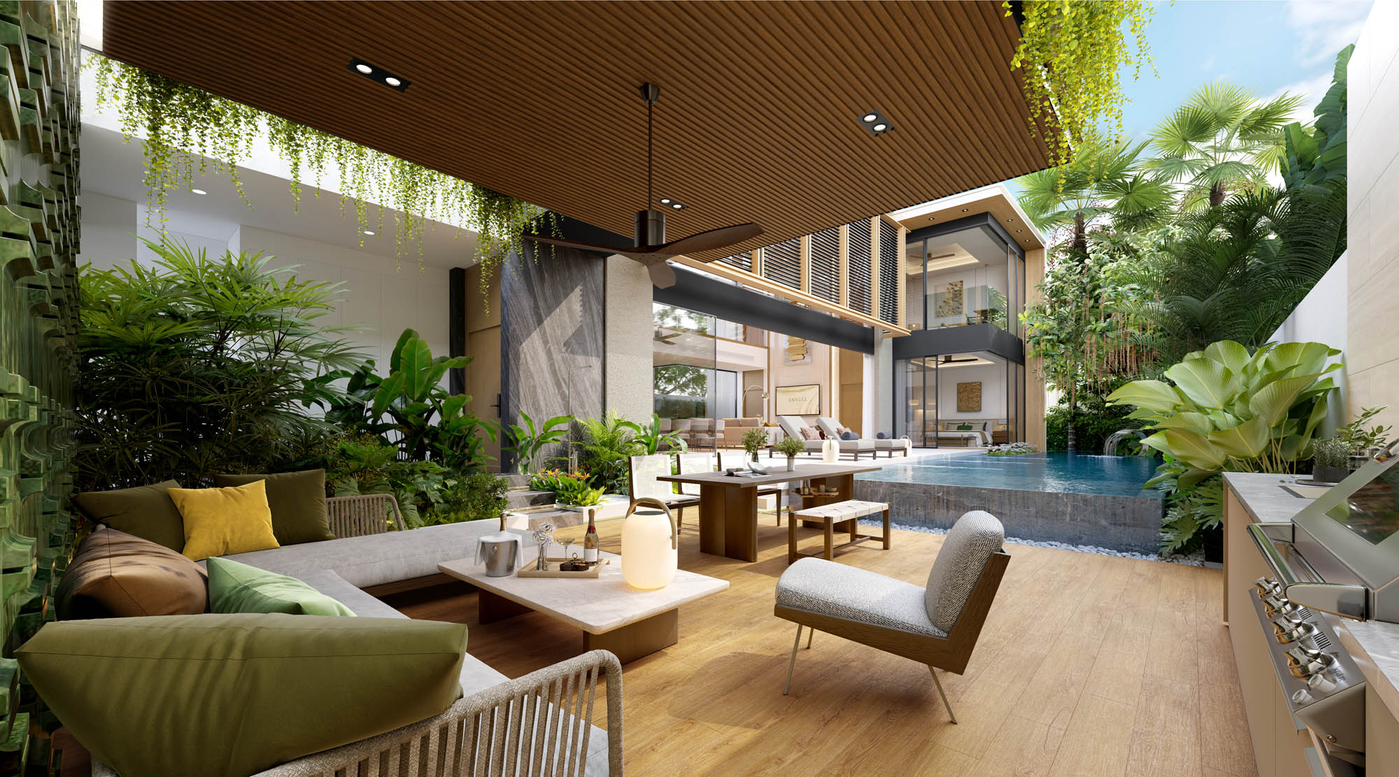 With a total usable area of 445.3 sqm, Villa Nara is ideal for families or investors looking for a peaceful lifestyle in one of Phuket’s most sought-after residential areas. The residence features a 38.10 sqm saltwater swimming pool, expansive indoor-outdoor living spaces, and a multipurpose treehouse pavilion that can function as a guest suite, office, or wellness retreat.
